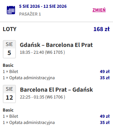 Gdańsk-Barcelona (5-12.08) – 168 PLN*