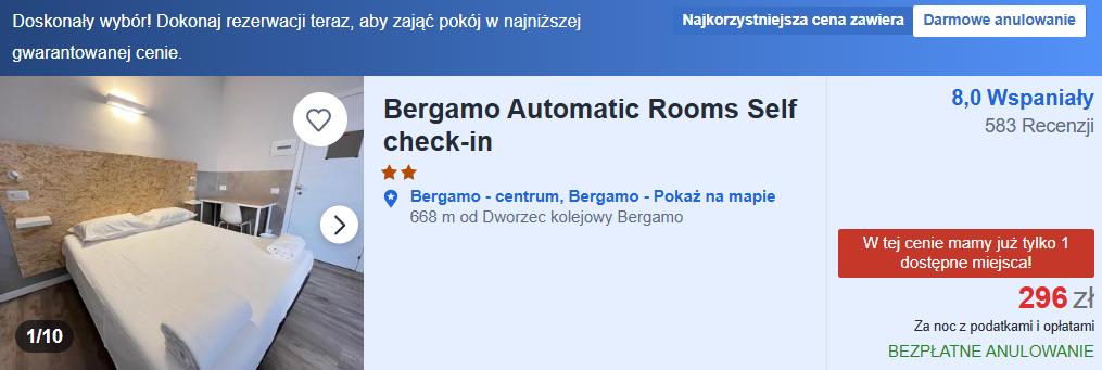 Nocleg polecam wziąć w Bergamo tuż przy dworcu kolejowym, dzięki czemu szybko dotrzecie na lotnisko oraz z dworca w godzinkę do Mediolanu. Najlepszy cenowo dla 2 osób TUTAJ.