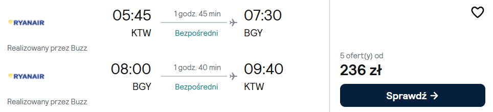Katowice-Mediolan Bergamo (21-22.04) – 236 PLN