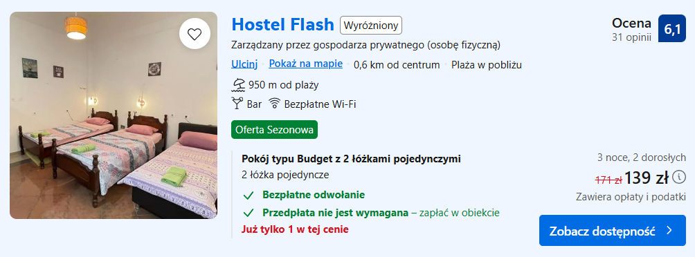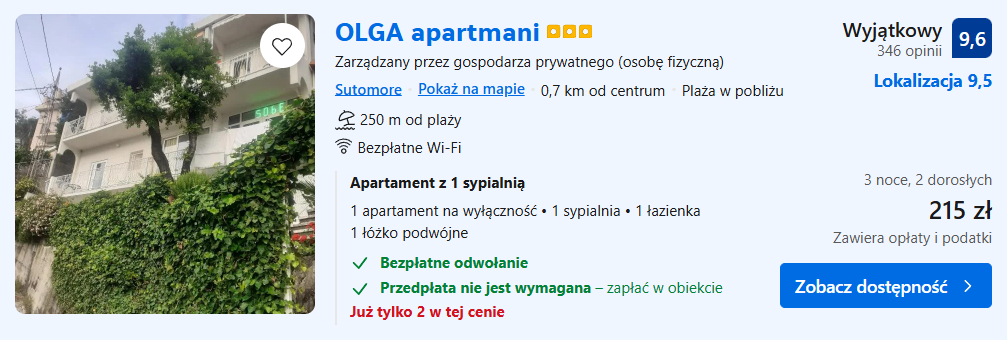 Ciut drożej, ale za to lepsza lokalizacja i bardzo wysoka ocena. W tak dobrej cenie zabukujesz TUTAJ.