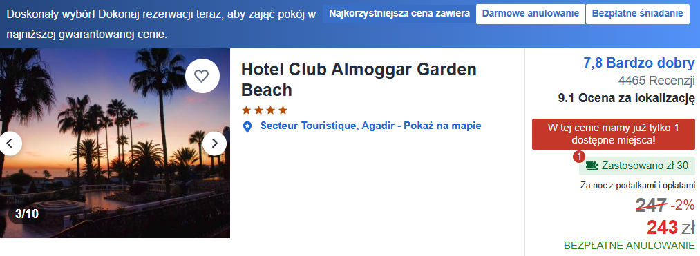 4* hotel z basenem i śniadaniami + blisko Oceanu w Agadirze zabukujesz w cenie 122 PLN/os za dobę przy pokoju 2-osobowym. Tak dobra cena dostępna jest gdy zarezerwujesz TUTAJ.