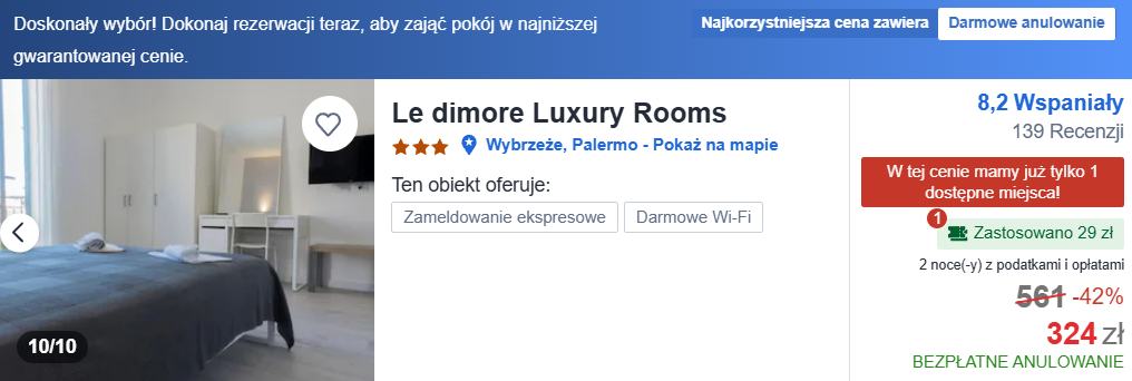 Bardzo tani nocleg w cenie 162 PLN na osobę przy 2 podróżnych (324 na pół), jest to wynik aż 42% zniżki, a tak tanio zabukujesz tylko TUTAJ.