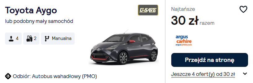 Niebywale niska cena za wynajem auta na 2 dni – jedyne 15 PLN na osobę, czyli 7,50 złotych za dzień. Tak tanio wynajmiesz TUTAJ.