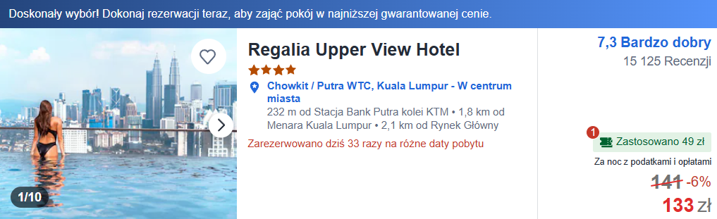 Świetny 4* hotel z basenem na dachu i niesamowitym widokiem panoramę Kuala Lumpur w cenie zaledwie 66 PLN/dobę na osobę przy pokoju 2-osobowym zabukujesz TUTAJ.